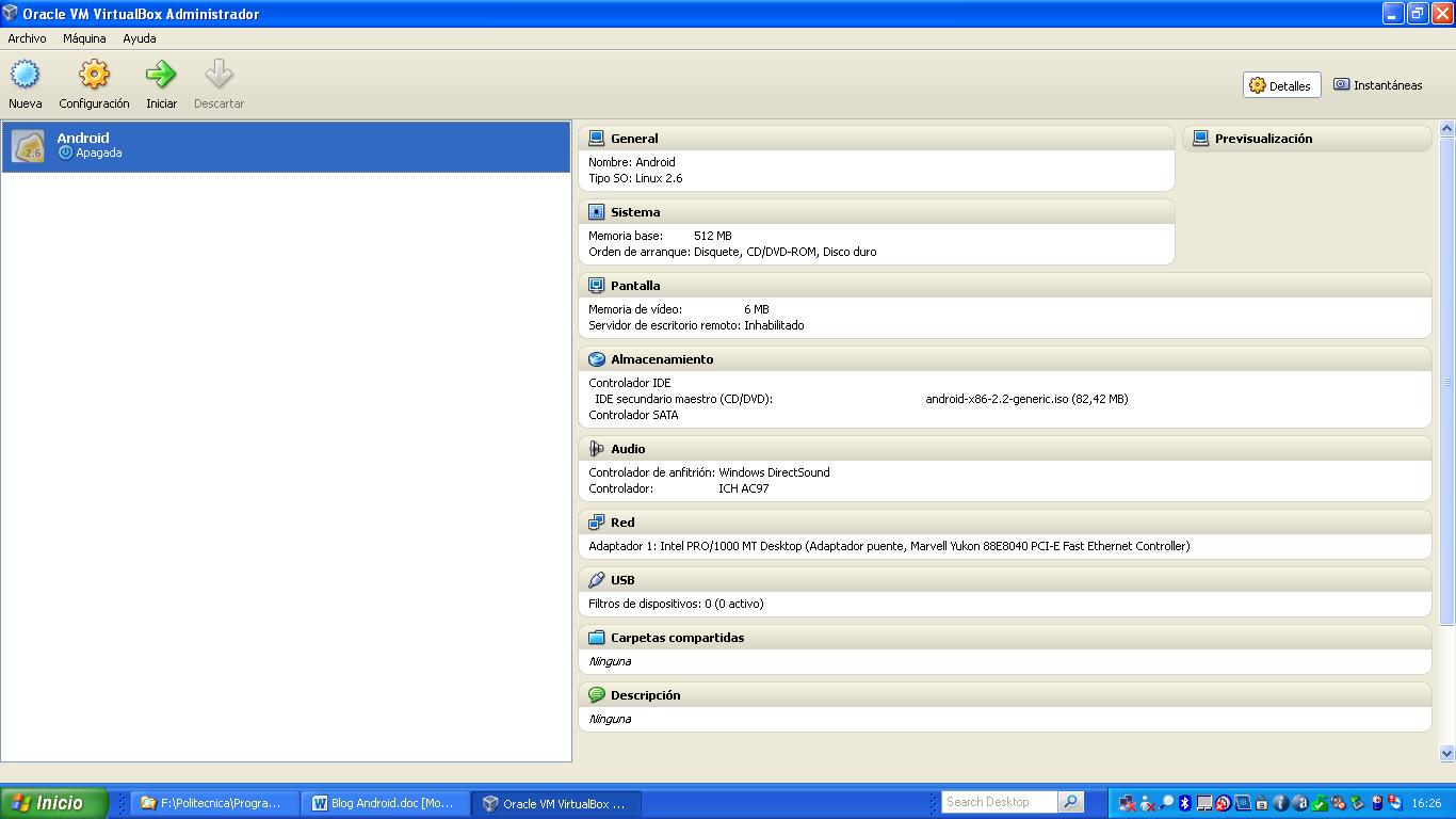 Una vez bajada las aplicaciones empezamos a instalar primero el VirtualBox-4.0.2-69518-Win y luego S.O Android las instalaciones no son nada complejas hay que definir en el Wizar la cantidad de memoria que tendrá el VirtualBox y disco duro, ya instaladas las aplicaciones la ejecutamos y nos presenta la siguiente pantalla.